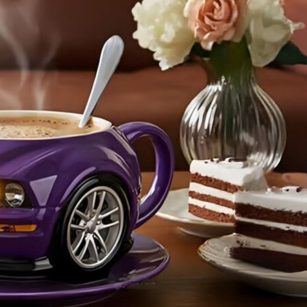 Featuring a realistic car design, this novelty coffee cup adds a playful touch to the morning brew with its charming sleek wheels