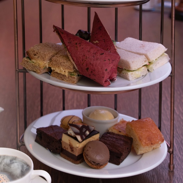Afternoon tea may include: scones with clotted cream, jam and preserves | macaroons | cakes | salmon and dill on beetroot wrap | cucumber cream and cheese sandwich | coronation chick on white bread | camomile tea | latte | green tea | fresh mint