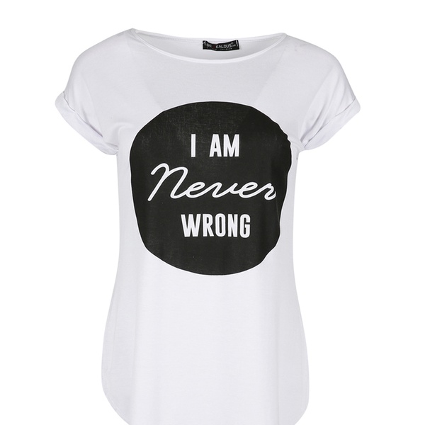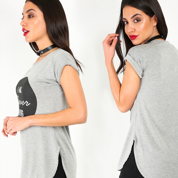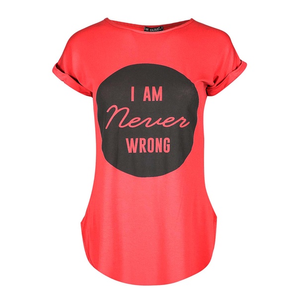 Basic T-shirt with turn-up sleeves, curved hem and a slogan print on front, available in several fetching colours
