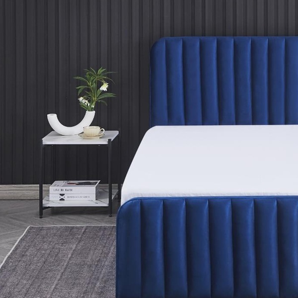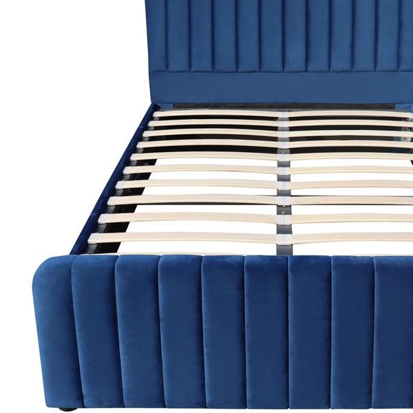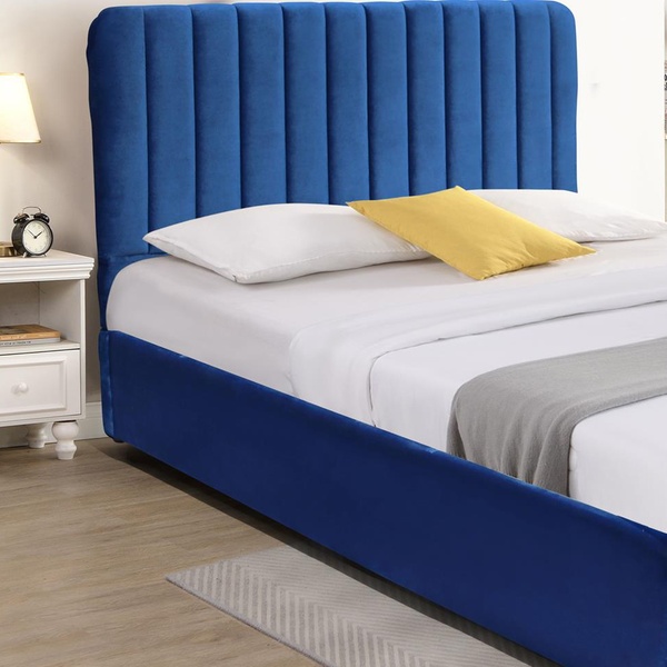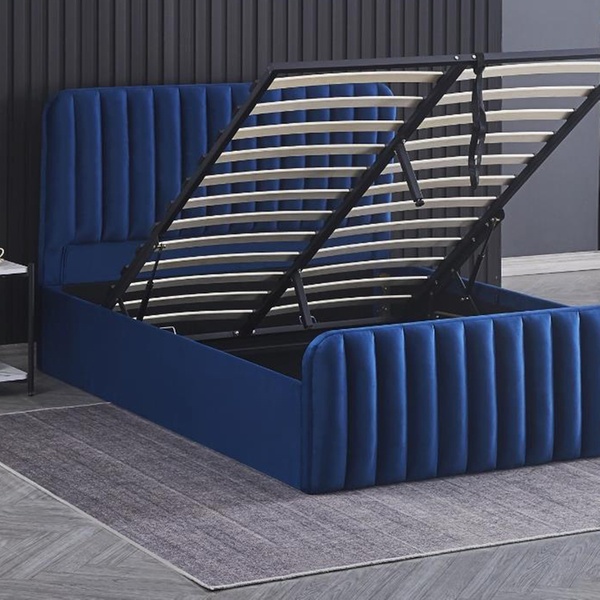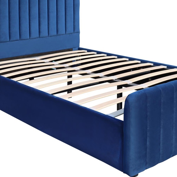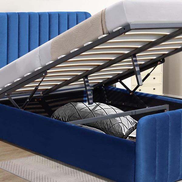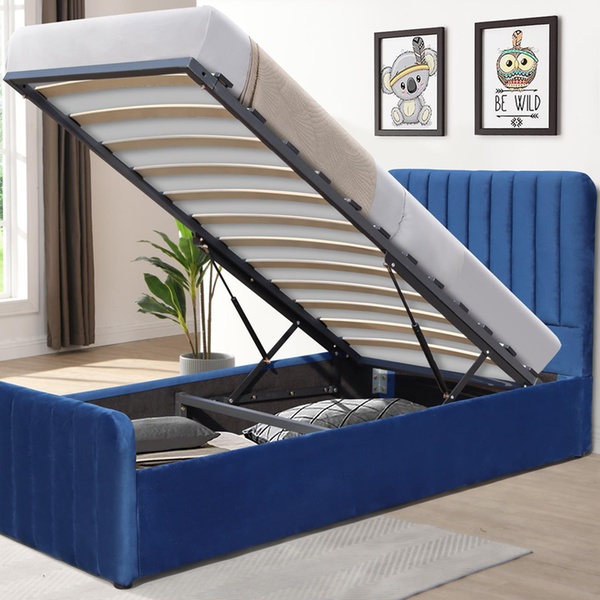 Upholstered in luxurious blue velvet, this compact storage bed combines style and functionality for any small room