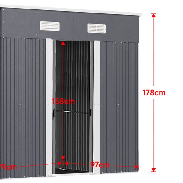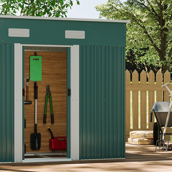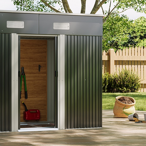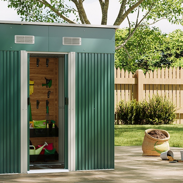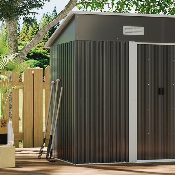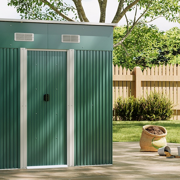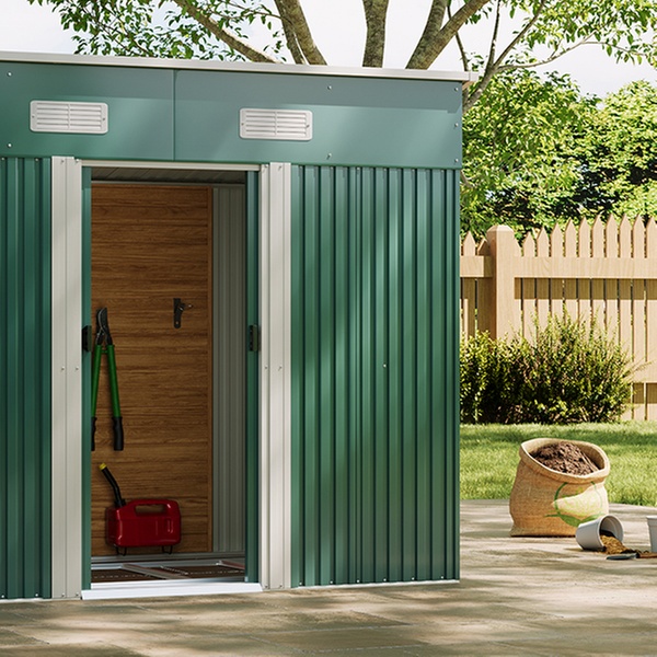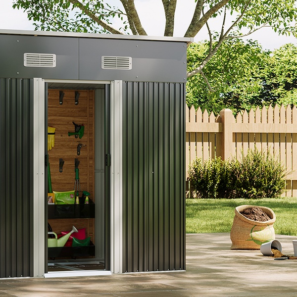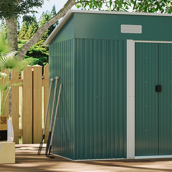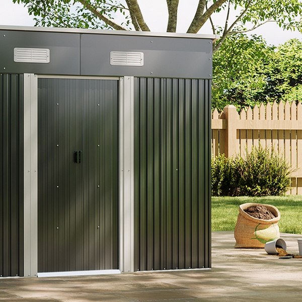 Effortlessly access garden tools with two double doors and enjoy enhanced airflow thanks to built-in vents in a durable metal design.