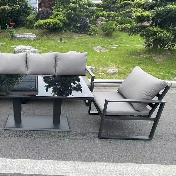 This corner sofa set boasts a height-adjustable table, allowing for seamless transitions between dining and lounging