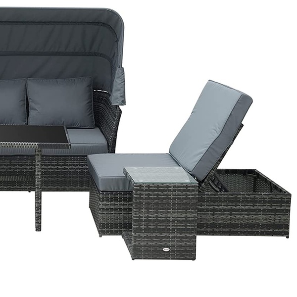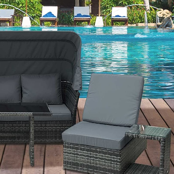 With a retractable canopy, this rattan furniture set offers adjustable sun protection for relaxed outdoor lounging.