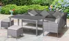 - Features one single arm 2-seater lounger and one double-arm loveseat, two footstools and a matching dining table
