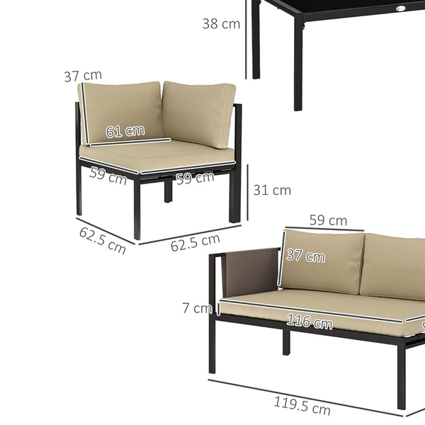 - Weight capacity: 240kg (loveseat), 120kg (corner sofa), 30kg (table)