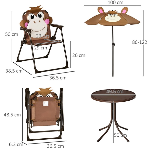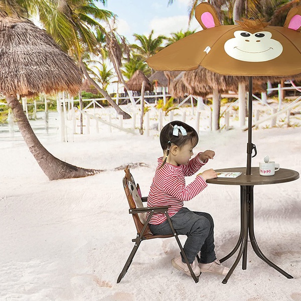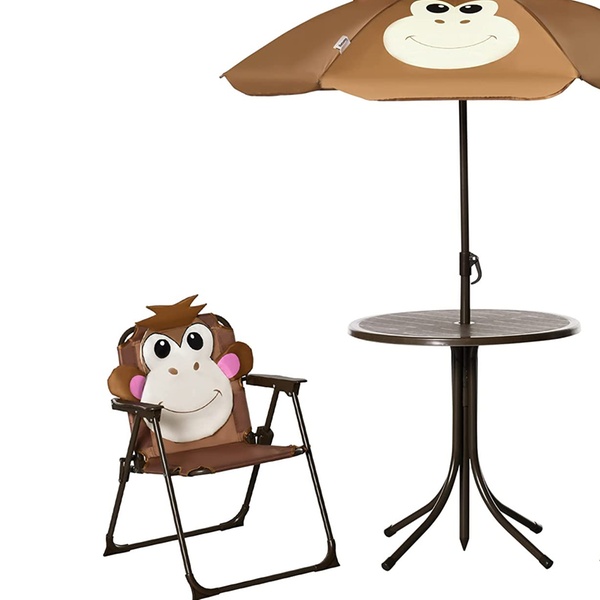 - Kids garden set includes 1 table, 2 foldable chairs, and a matching umbrella