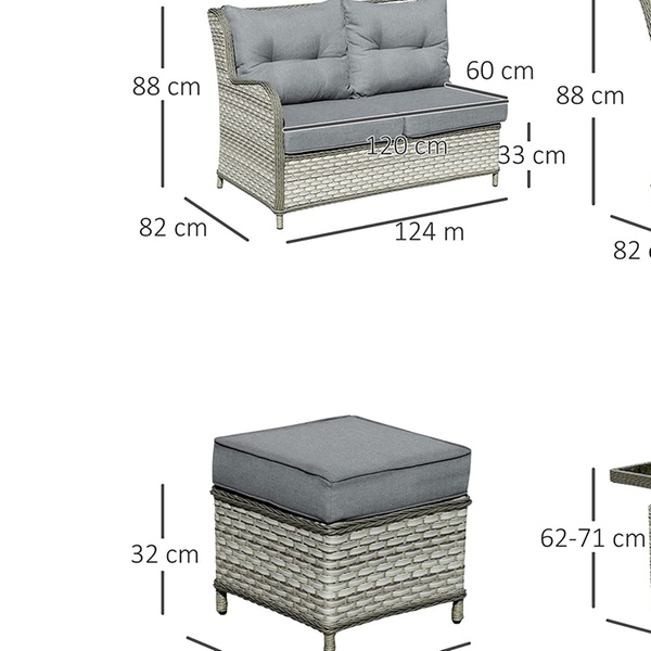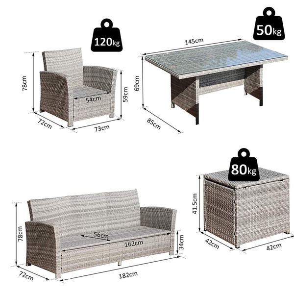 - Weight capacity: 110kg (single seat), 70kg (footstool), 70kg (coffee table).