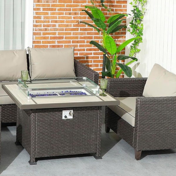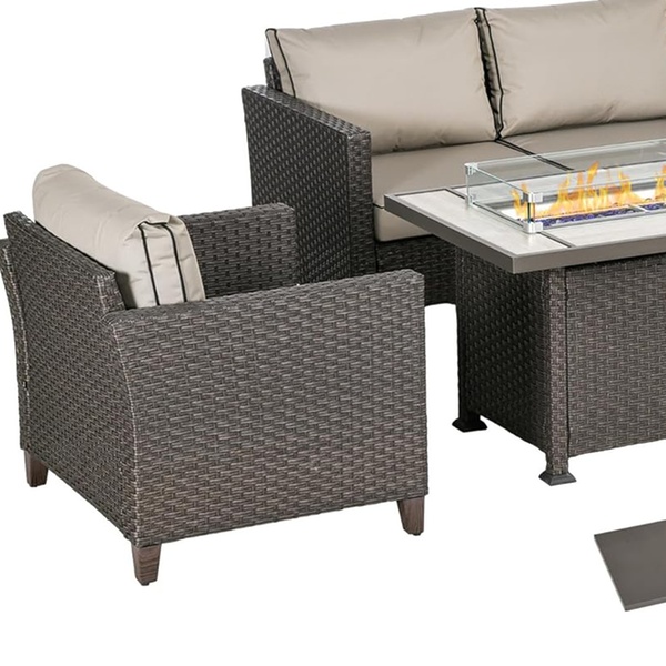 - Five-piece set: includes two side chairs, two armchairs, and a fire pit table