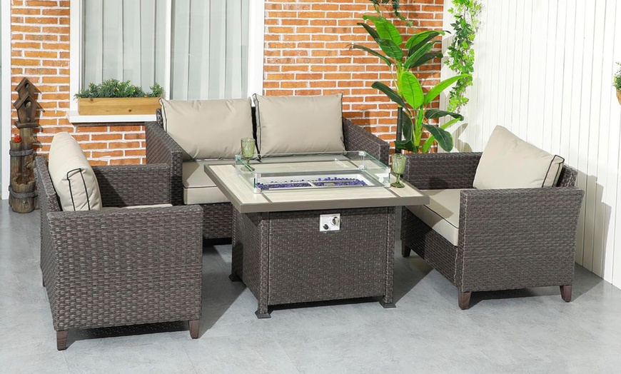 Today's Groupon offers an Outsunny 5-Piece Rattan-Effect Furniture Set with Gas Fire Pit Table, distributed by MHstar UK Ltd.