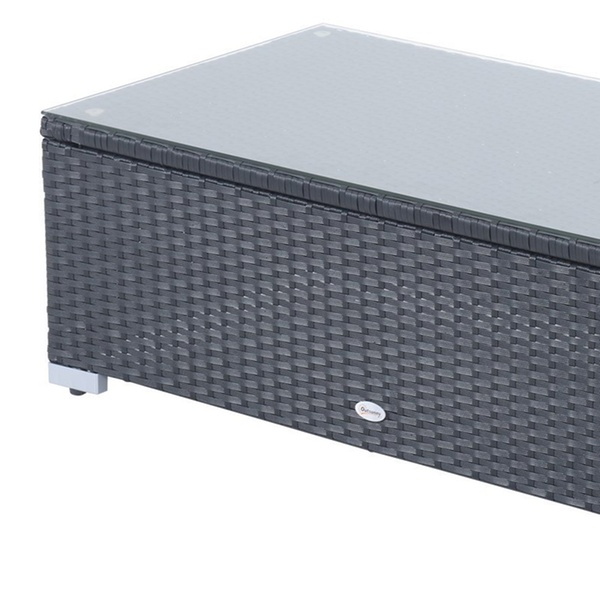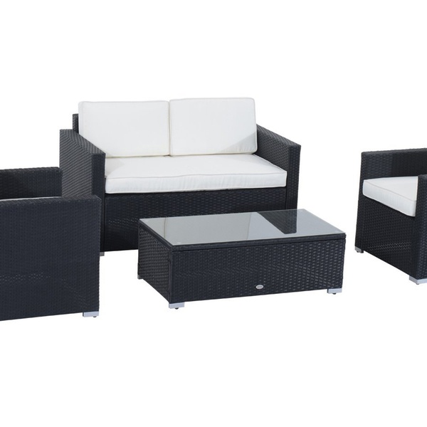 This comfy rattan-effect set comes completed with matching colour seat cushions and a glass topped coffee table; optional patio heater