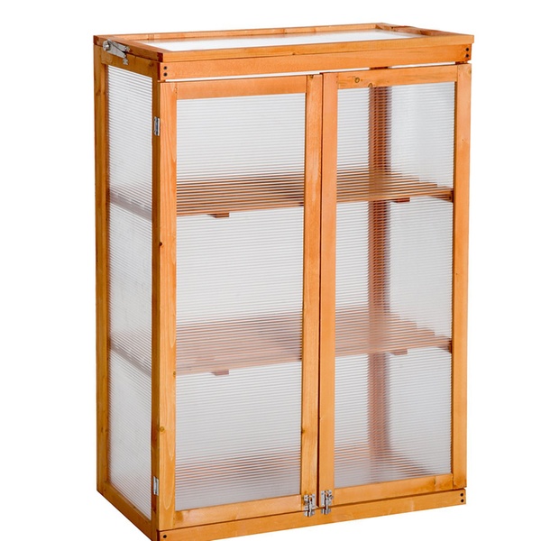 Made of durable fir wood, this three-tier greenhouse can be ideal for early sowings, cuttings, and over-wintered plants