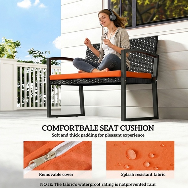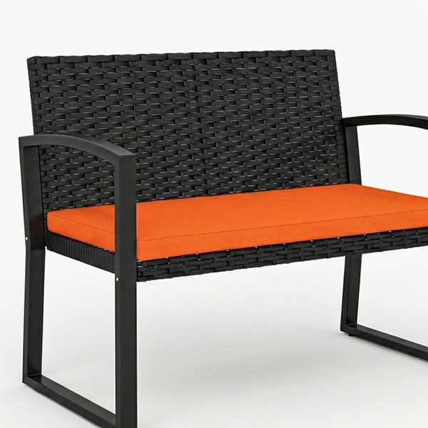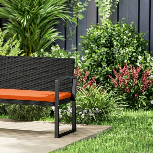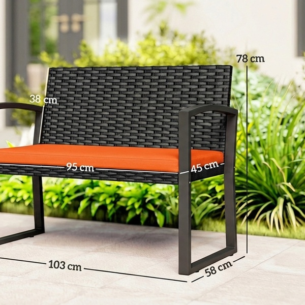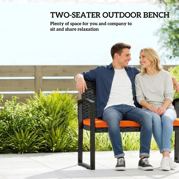 A stylish two-seater garden bench with a sturdy steel frame, rattan-effect finish and cushioned seat for comfortable outdoor relaxation