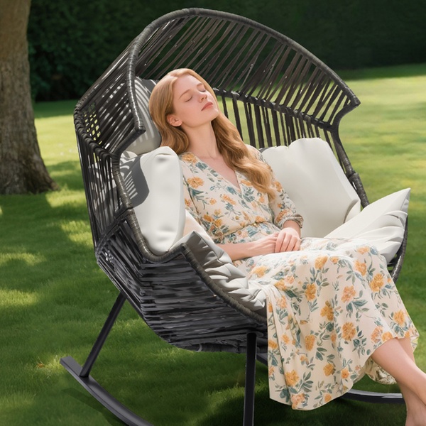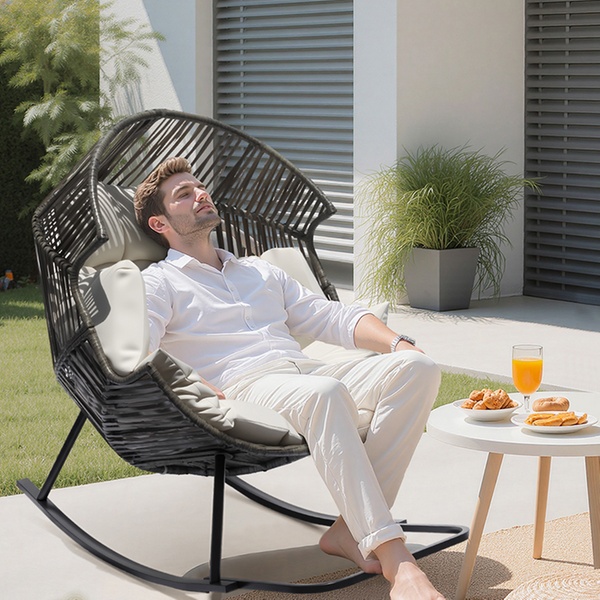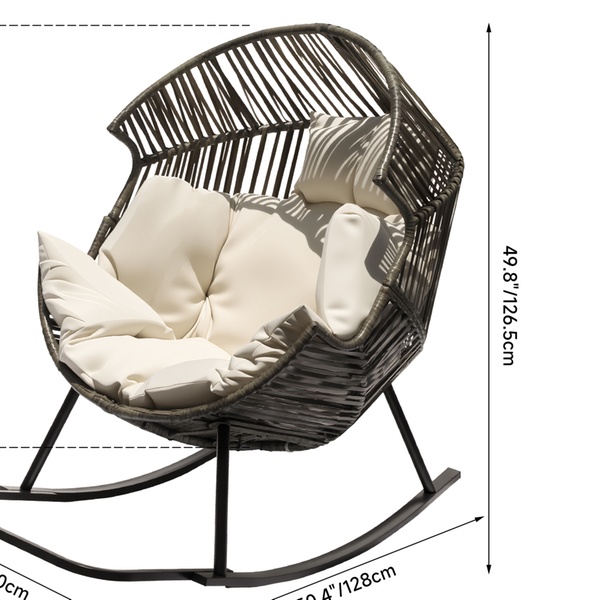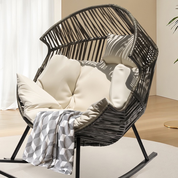 ** Indulge in ultimate comfort and transform any space with our Spacious Rattan Rocking Chair More than just a seat, it's your personal oasis, featuring an ergonomic egg-shaped design and a plush, extra-thick cushion for unparalleled relaxation. Crafted with durable, weather-resistant rattan and a robust steel frame, this generously sized rocker is built to last and designed to soothe, whether on your patio, by the pool, or nestled in your living room. Experience the perfect blend of elegance, stability, and blissful gentle motion – your new favorite spot awaits!
