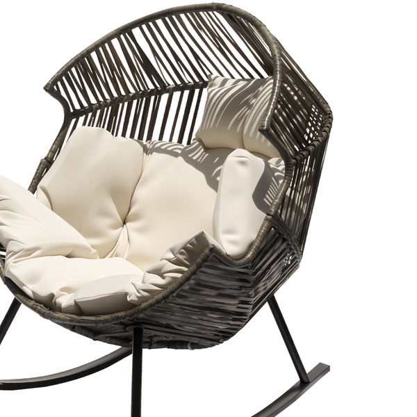 This Spacious Rattan Rocking Chair with Thick Cushion features an ergonomic egg shape, ensuring a snug fit and ultimate comfort for relaxation