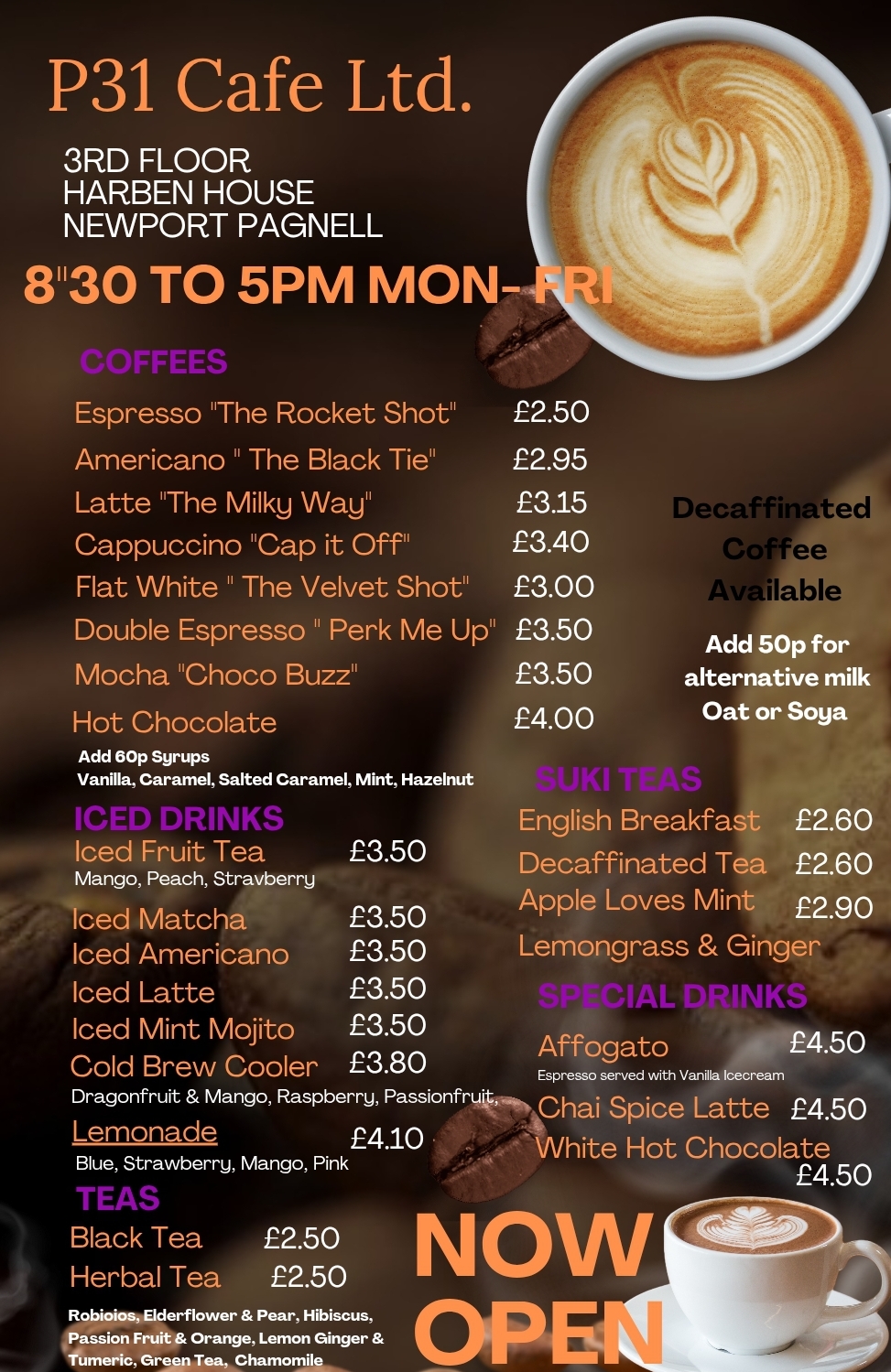 Hot drinks options include various types of coffees, hot chocolate, and teas