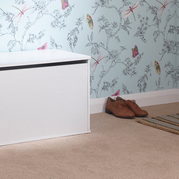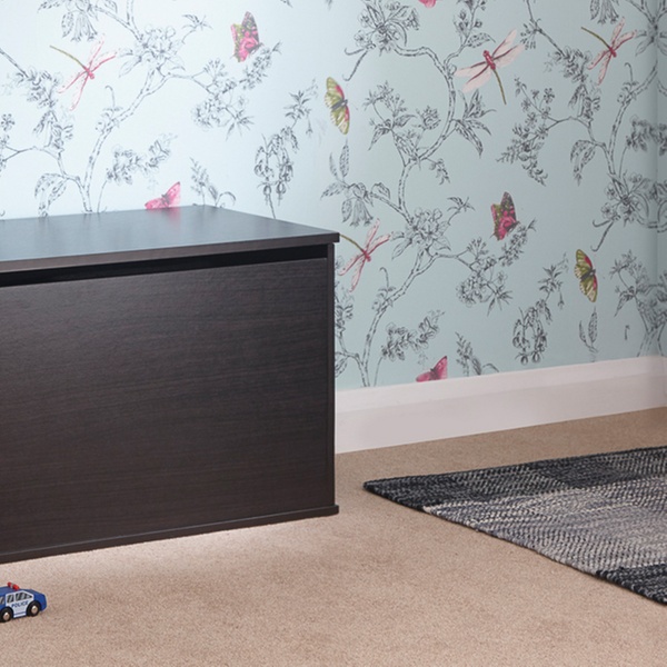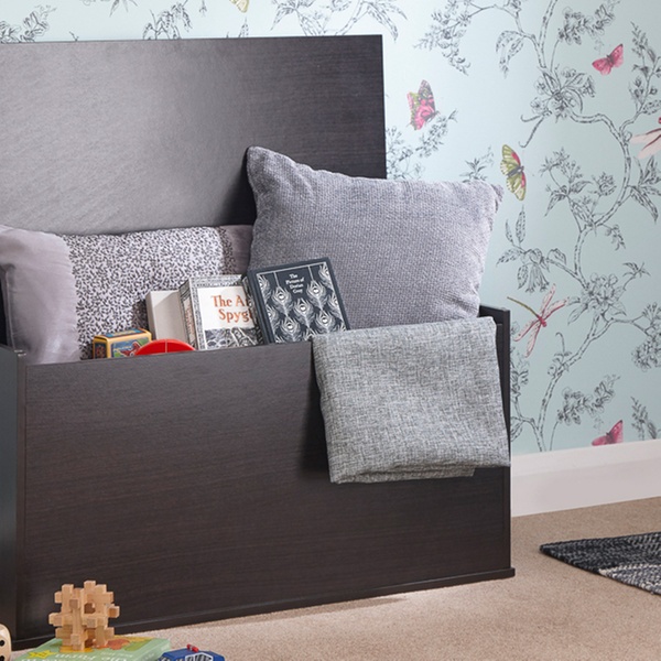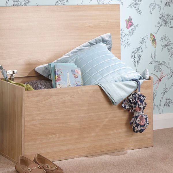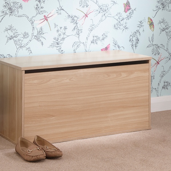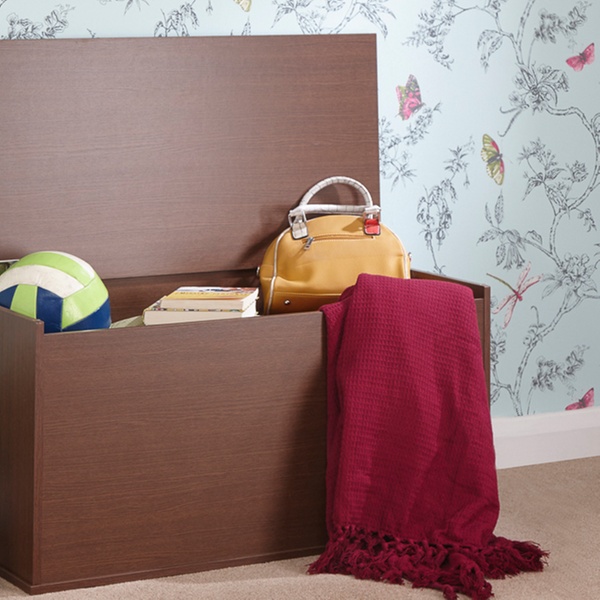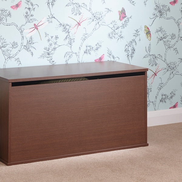 Offering ample storage space for household accessories, this ottoman features a wood-effect design and safety hinge