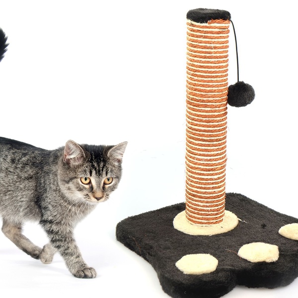 - Made for indoor use, the scratching post features a sisal post, soft paw print base and rattle pom pom