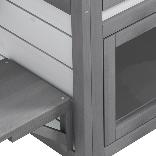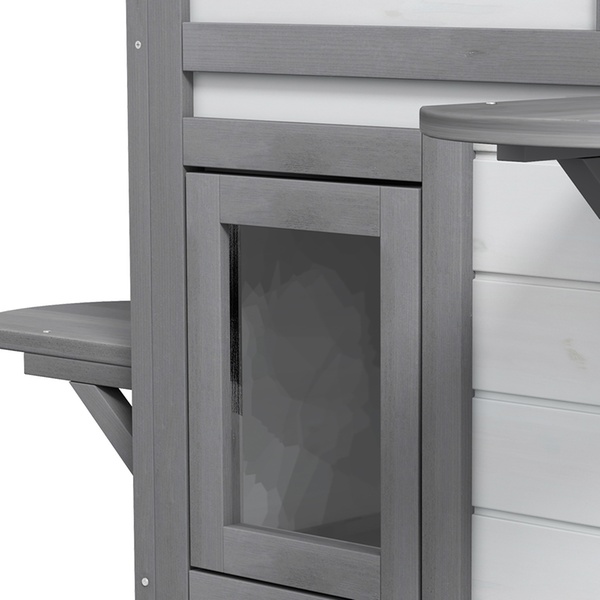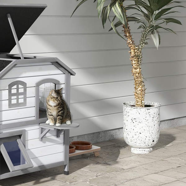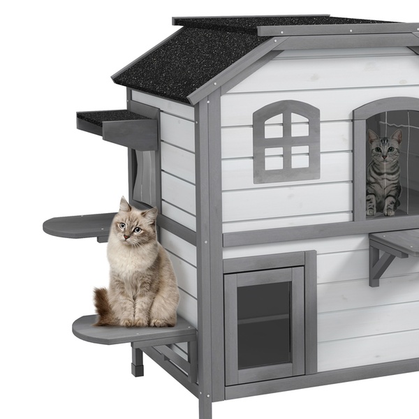 A spacious two-level cat house with fun access features keeps furry friends entertained, offering comfort both indoors and out