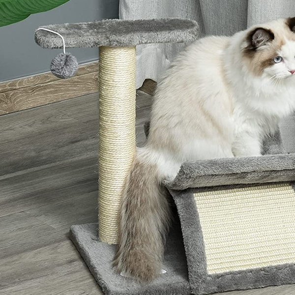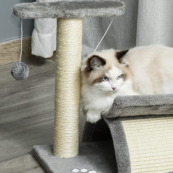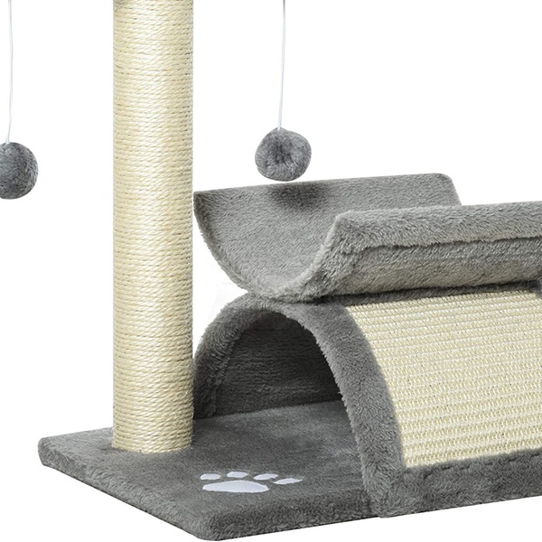 - Scratching bridge, top rotatable pole, and 2 dangling pom-pom balls