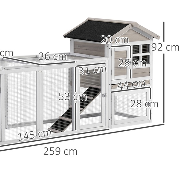 - Run boxes sizes (under the main house): 51cm (L) x 53cm (W) x 36.5cm (H), Door: 44cm (L) x 28cm (H)