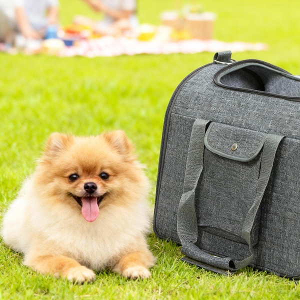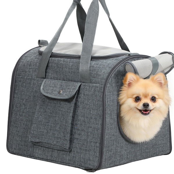 Travel in style with a spacious, soft-sided cat carrier featuring large mesh windows for ventilation and easy interaction