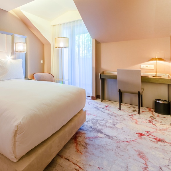 The Deluxe Room is available in two versions, both twin and double (with a queen-size bed). With its contemporary decor, it has also been designed to include all the comforts of home with its coffee machine, its desk corner and its marble bathroom. Through the windows, you can watch the hustle and bustle of the avenue, while remaining in your peaceful bubble.