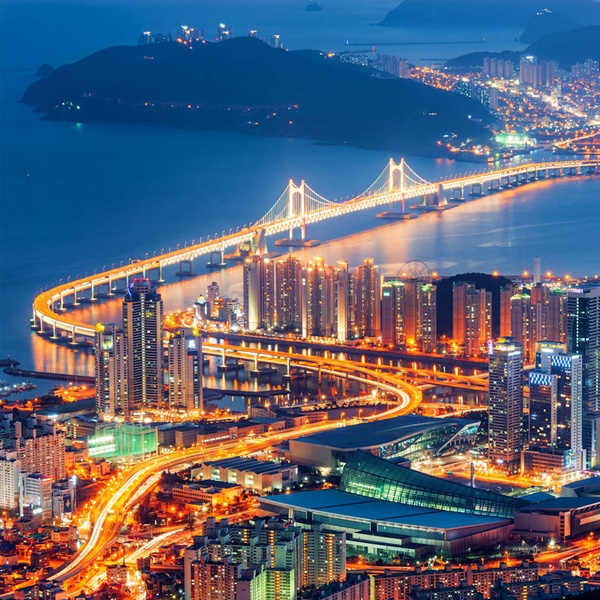 Stroll through the BIFF cinema district, then relax on Gwangalli beach in front of the illuminated bridge.