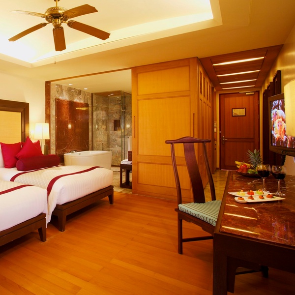 This large room has a king-size bed or two double beds with soft bedding. It features wooden furniture in warm tones. Enjoy this air-conditioned space or the large balcony that extends the room to the outside. Immerse yourself in a bubble bath to relax.