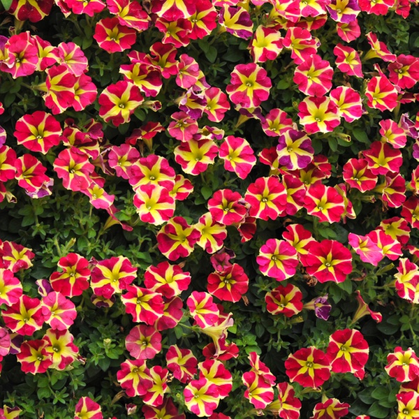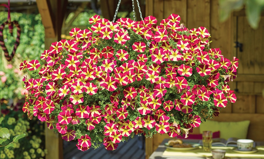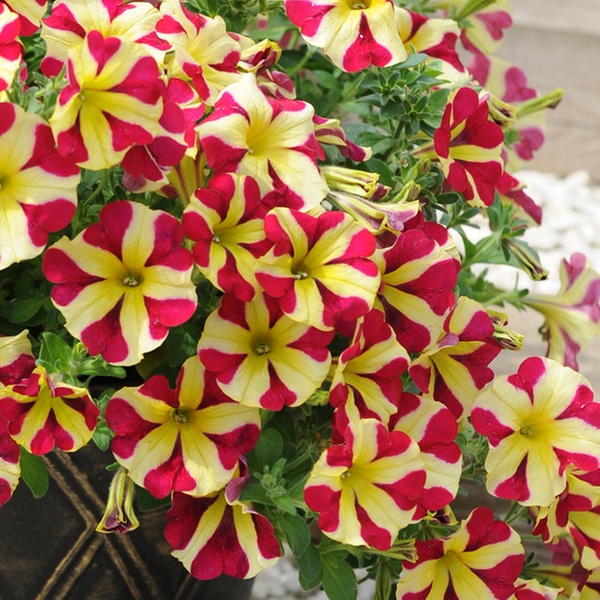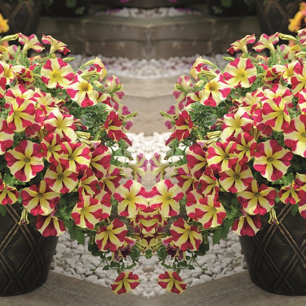 This floriferous, semi-trailing petunia with five eye-catching red hearts on each bloom looks good when grown in a hanging basket