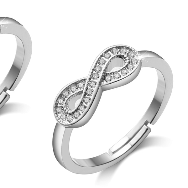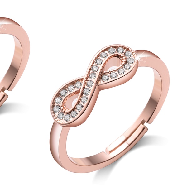 Featuring sterling silver or rose gold plating and Crystals from Swarovski®, these Philip Jones Infinity rings come in a pouch packaging