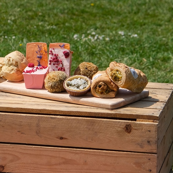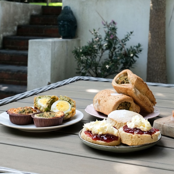 Experience the Classic with savory Quiche Lorraine and traditional Scotch Eggs. Vegetarian options feature Mini Vegetarian Rolls and cakes. Vegan Tea includes Vegan Scones, Rainbow Beetroot Scotch 'Eggs', and assorted vegan cakes for a delightful tea-time experience.