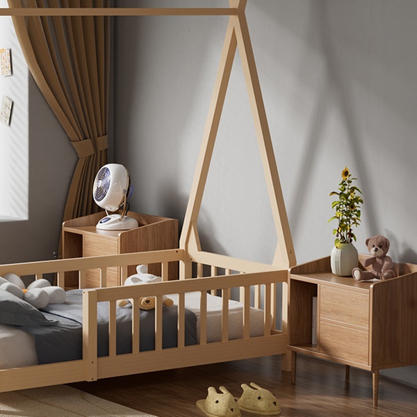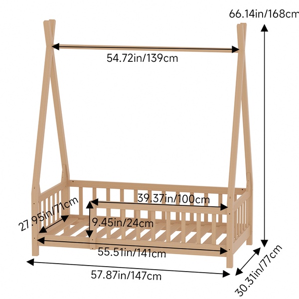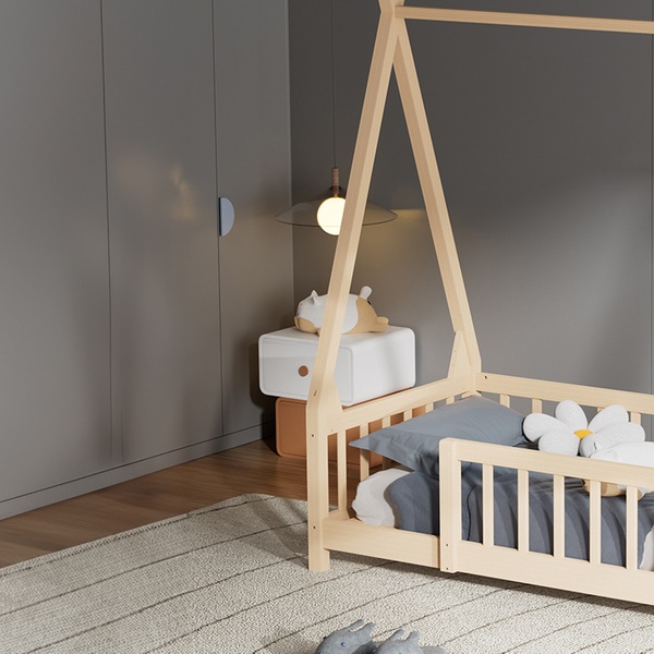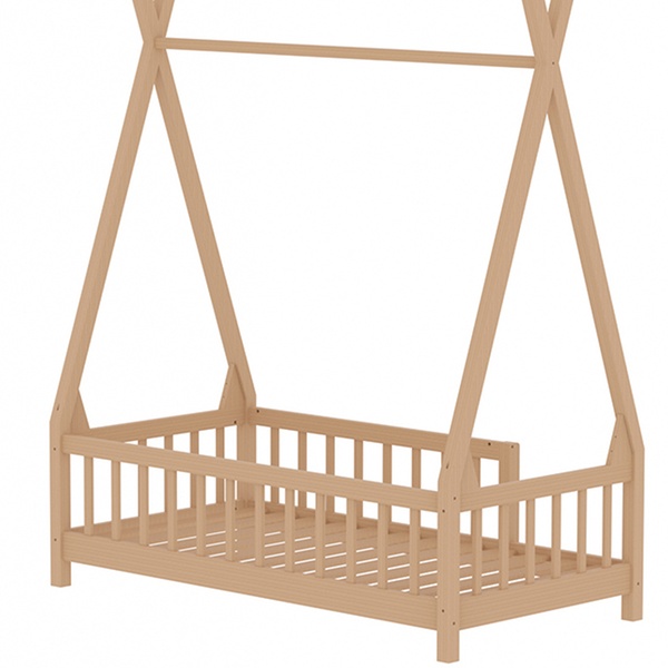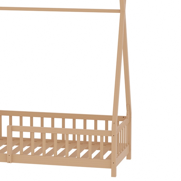 Crafted from 100% pine wood, this tent-shaped kids' bed frame adds a touch of whimsy while ensuring safety with its sturdy guardrails