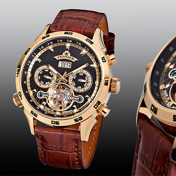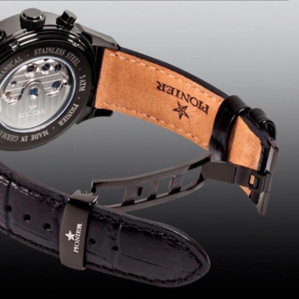 Sparkling with twelve 1-1.1mm diamonds, and water-resistant to 3ATM, these skeleton-style Pionier watches come with a two-year warranty
