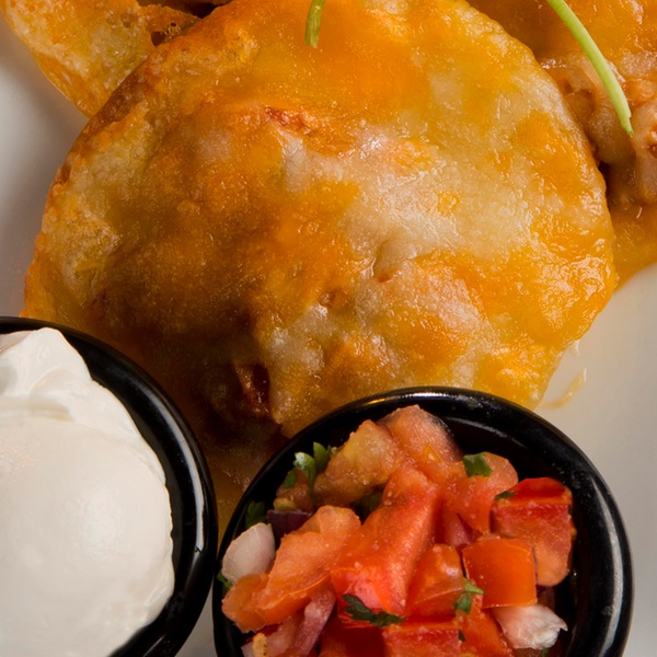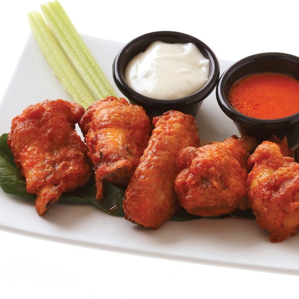 - Starters available include: fried chicken wings in a spicy wing sauce served with celery sticks and a blue cheese dressing | dip of Swiss, cheddar and aged cheddar, mozzarella and vegetarian parmesan cheeses with spinach, artichoke hearts and roasted tomato, served with corn tortilla chips | crispy mini tortillas topped with barbeque chicken, sautéed onions, sharp cheddar and red cheddar with sour cream and pico de gallo