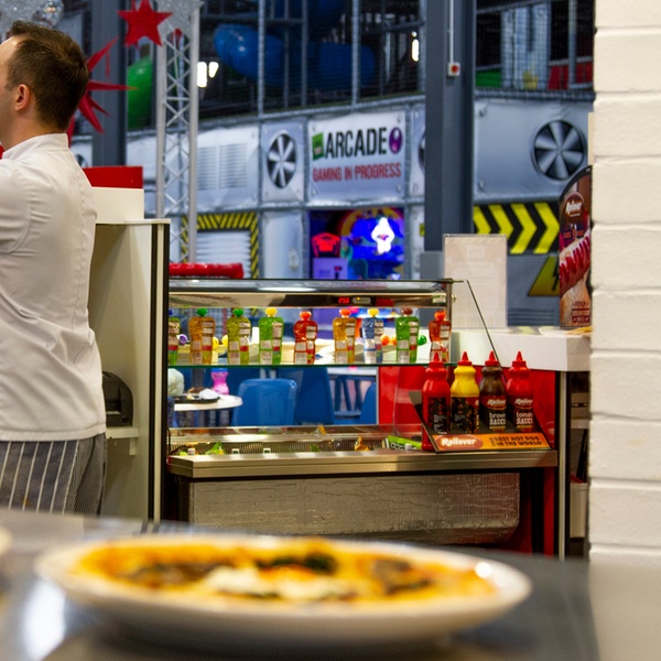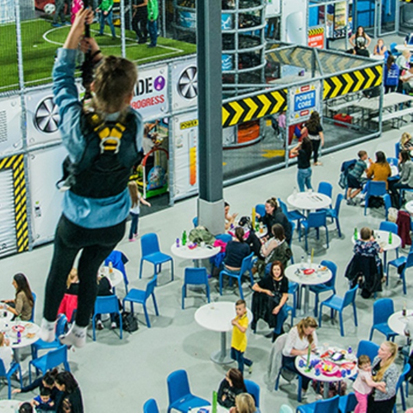 Our indoor play frame is a maze of tunnels, slides, and obstacles, perfect for kids aged 5 to 16 (and adults, too!). And for the little ones, we have the largest toddler play area in the UK, complete with soft shapes, slides, and interactive games. Experience the thrill of our ValoJump trampolines, where you can play games while getting a workout. For an out-of-this-world adventure, thrill-seekers can hit the gas and experience the need for speed in a state-of-the-art Racing Simulator. But the fun doesn't stop there—grab a blaster and join the action in our Star Wars-themed laser tag arena, or soar through the air on our thrilling zip wire.