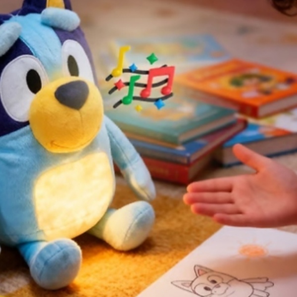 Soft, interactive plush toy with calming music, lights, and educational features, ideal for children aged 3 and above