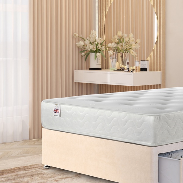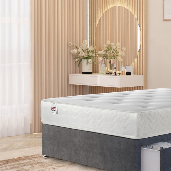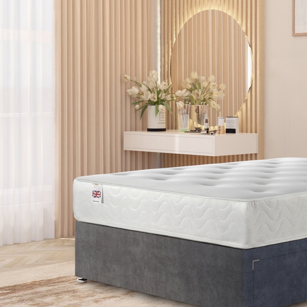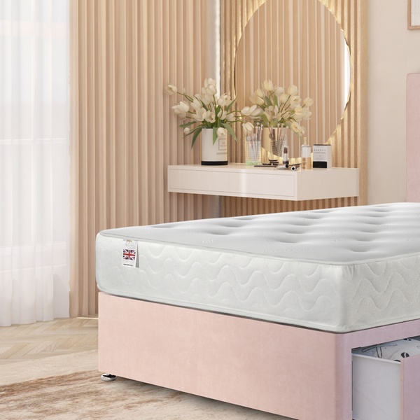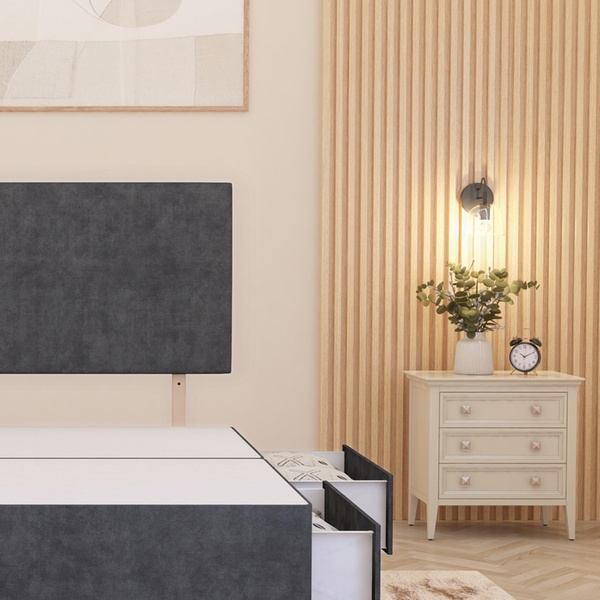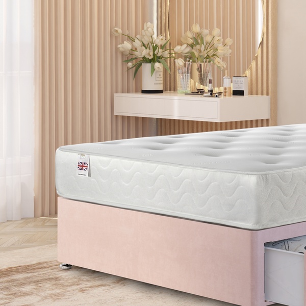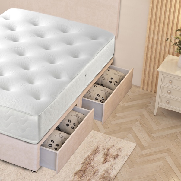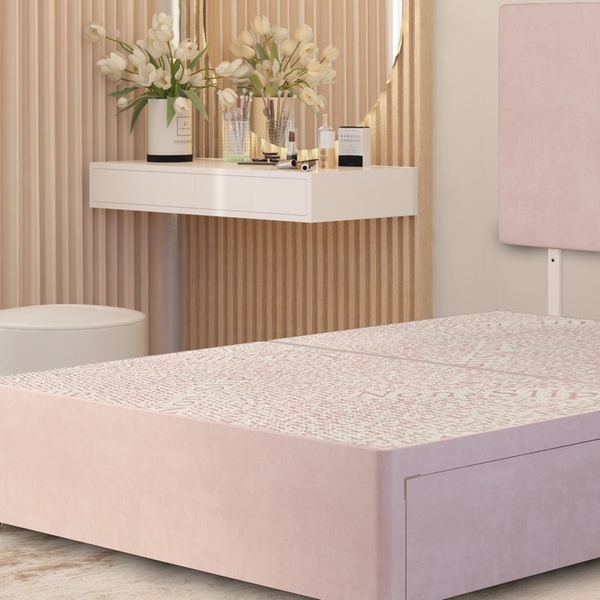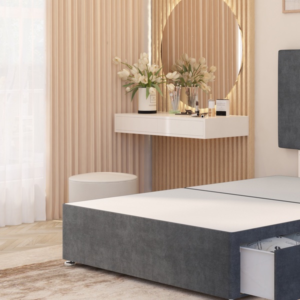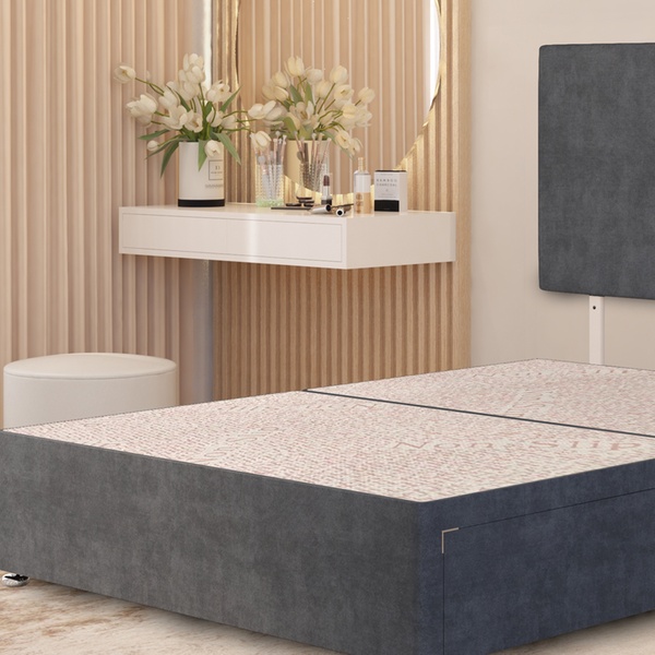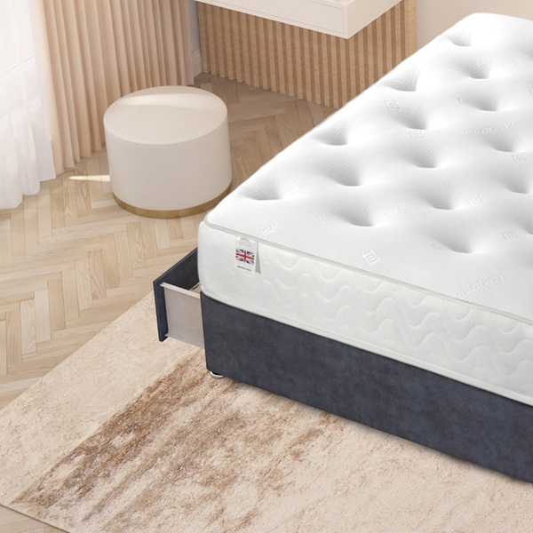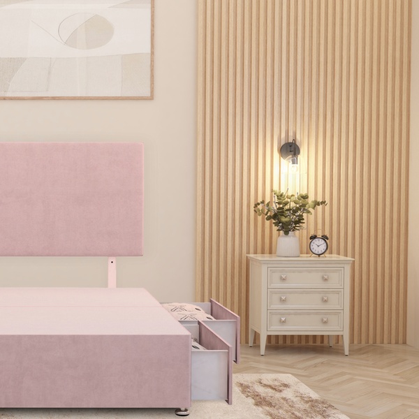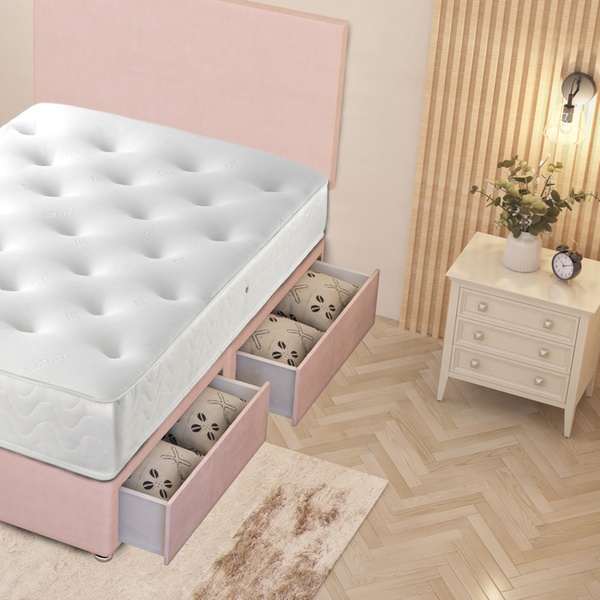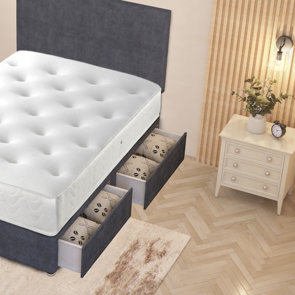 A practical divan bed set featuring a plush velvet upholstered base, four spacious storage drawers, a solid platform top, and a best-selling 10" sprung memory foam mattress
