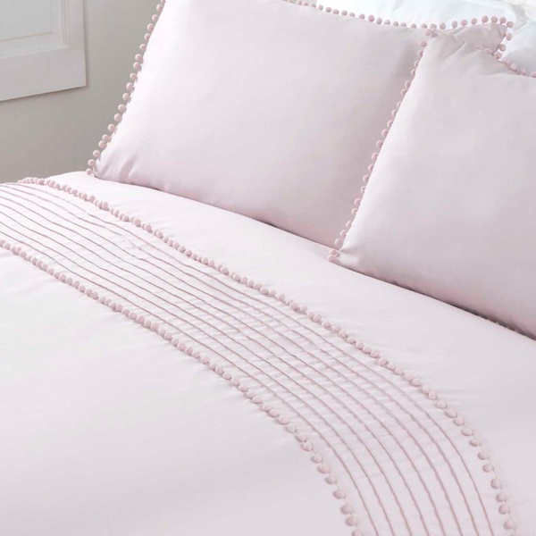 The straightforward design features a delicate bobble trim that either contrasts against the plain white cover or complements the simple blush pink option. This duvet set is made from a soft polycotton blend, is easy care, and requires little to no ironing.
