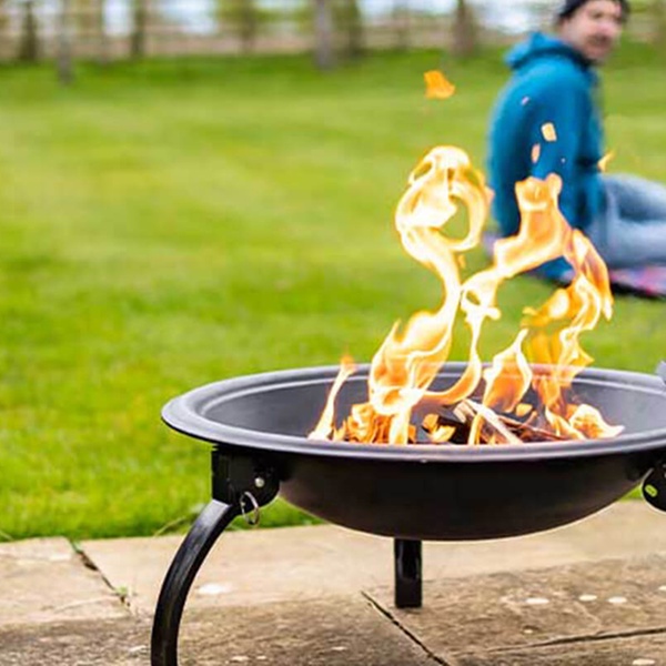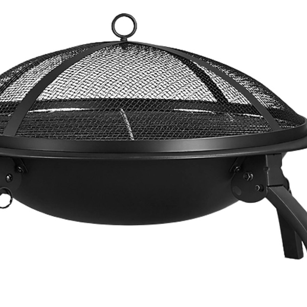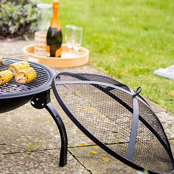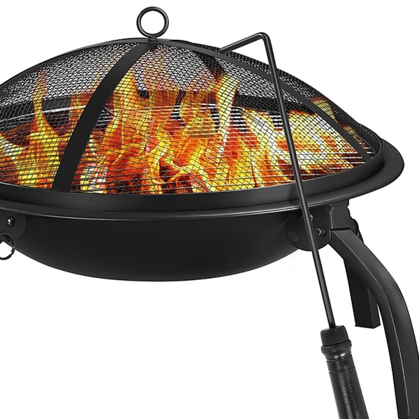 Enjoy warmth and outdoor cooking with this portable outdoor fire pit and grill, featuring easy setup, a foldable design for transport, durable steel construction, a mesh safety lid, and suitability for patios, gardens, and camping