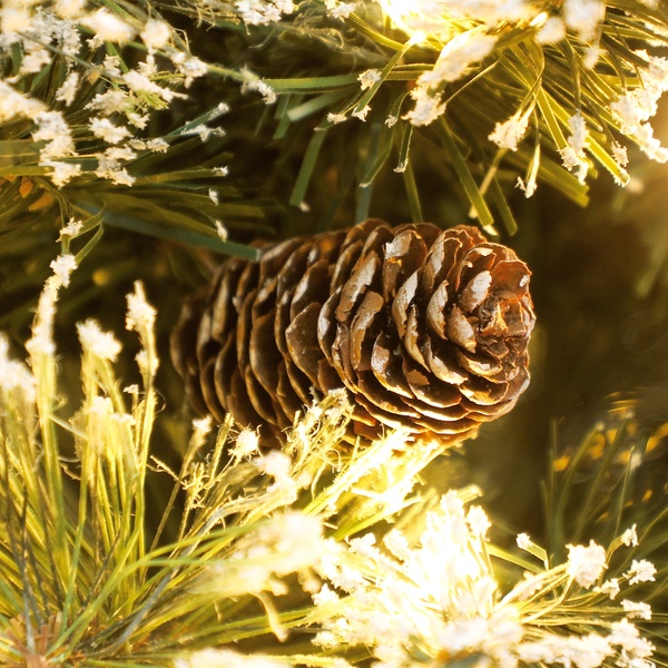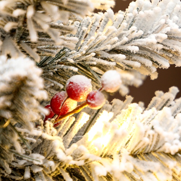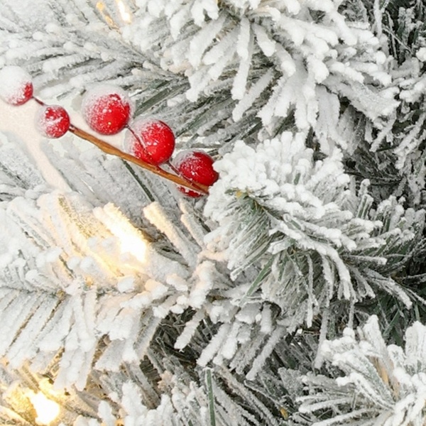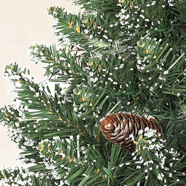 - Features snow-flocked branches and is decorated with 6 pine cones.