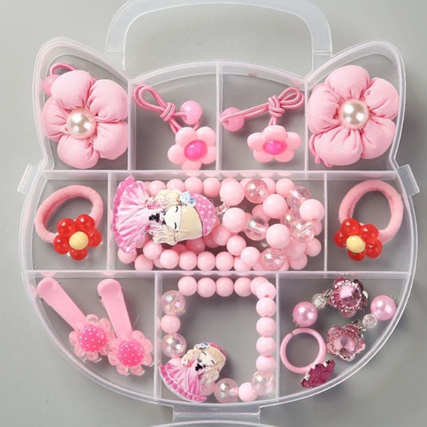 Ideal for leisure occasions, this plastic princess-themed set includes a cat box, necklace, bracelet, ring, earrings, rubber bands, and hairpins in various color options