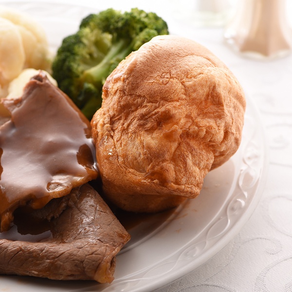 - Main courses available include: roast beef or pork, or vegetarian roast of the day with roast potatoes and a selection of vegetables | homemade beef lasagne with chips and a salad garnish | deep-fried breaded plaice with chips and peas | sliced home-baked ham with fried egg, chips and peas | three local pork sausages with creamy mash potato, peas and gravy | three-egg cheese omelette with chips and a salad garnish