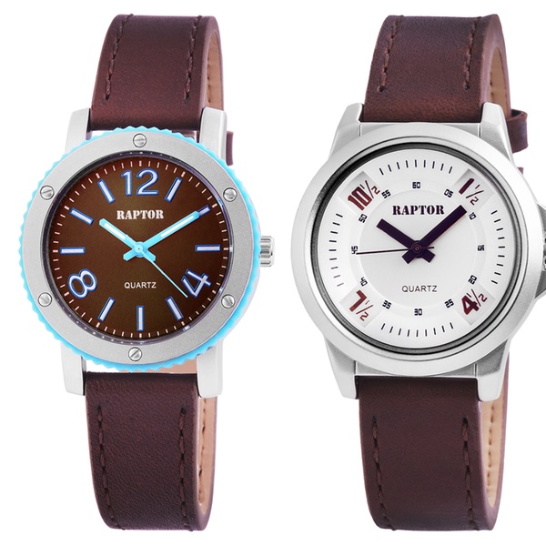 Featuring Miyota quartz movement and metal case with bezel, these Raptor men’s watches have leather bracelet and 3ATM water resistance
