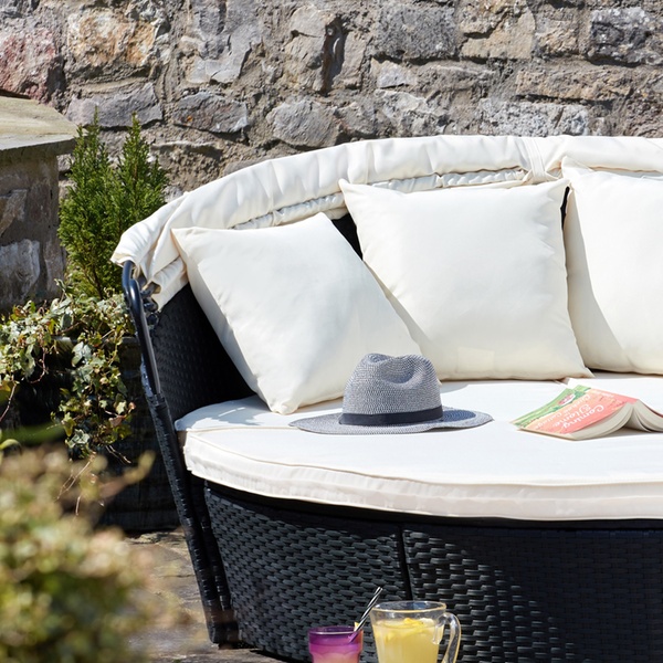 This comfortable day bed can be separated into four pieces to sit up to eight people and features a retractable canopy that provides shade