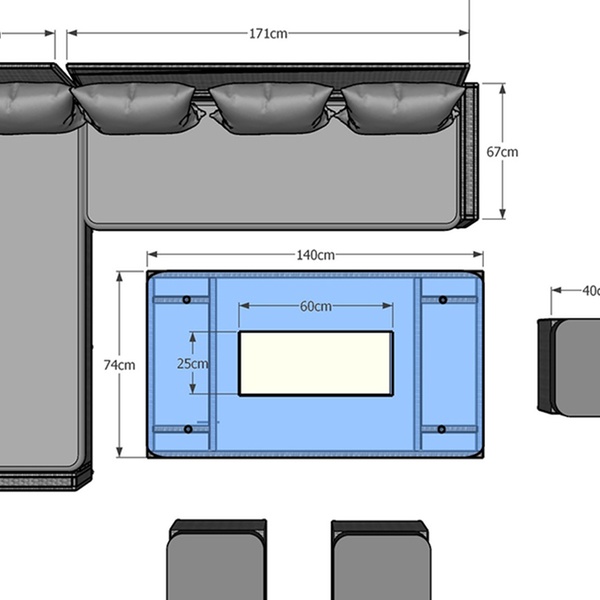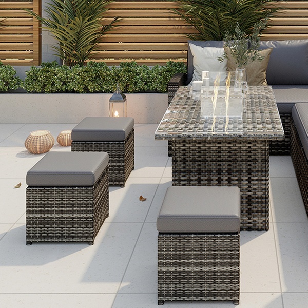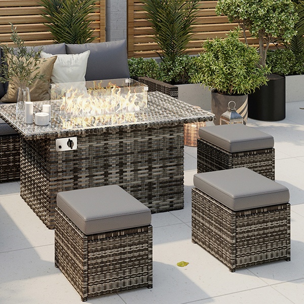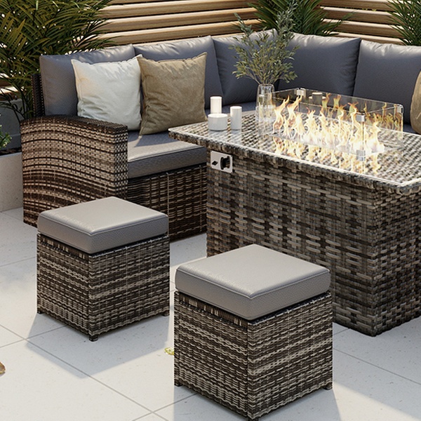 - Features a 9-seater corner sofa with a fire pit dining table set