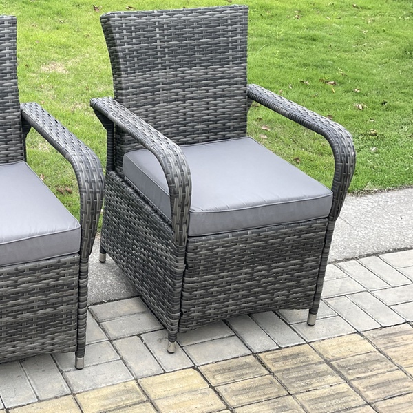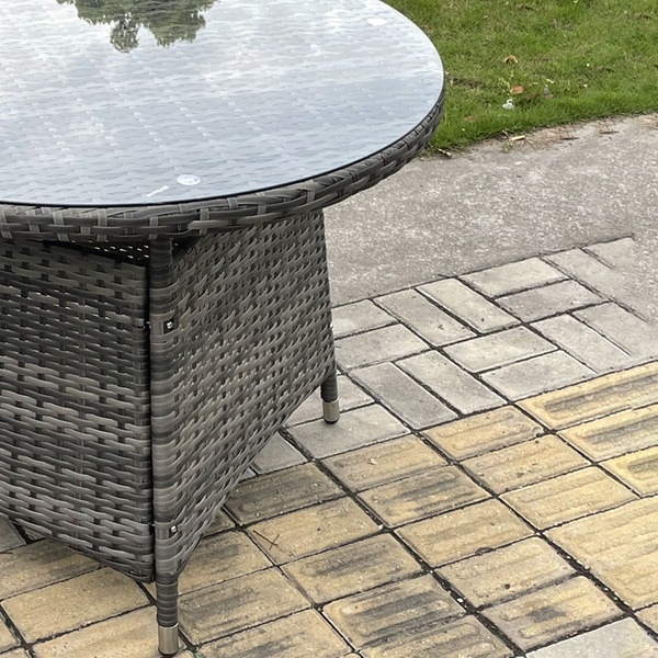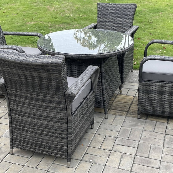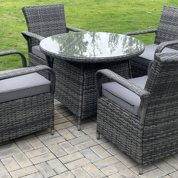 - Includes four chairs with 8 cm base cushions (without back cushions) and a round table.