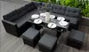 Rattan Effect 9 Seater Corner Sofa with 3 Stools and Glass-Top Table, with Cushions