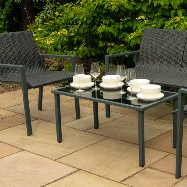 This rattan-effect patio furniture set features a sleek tempered glass tabletop, making clean-up a breeze while elevating outdoor style