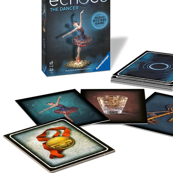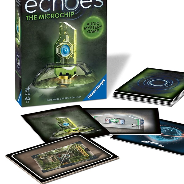 Ravensburger Echoes is an immersive audio murder mystery game for 1–6 players aged 14+, where players solve a futuristic mystery by finding and arranging audio clues using the free app