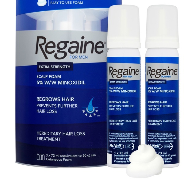 This scalp foam, supplied in packs of three 73ml bottles, is formulated to help re-grow hair and prevent further hair loss